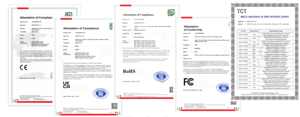 Vaper6 all products hold authortative Internationacertifications, including MSDS and TPD, ensuring full compliancewith regulatory standards worldwide.